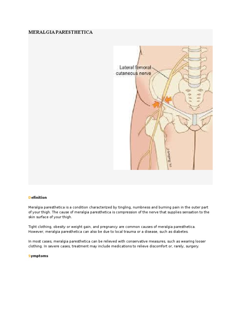 These can include injury to the hip area. Meralgia paresthetica or meralgia paraesthetica is numbness or pain in the outer thigh not caused by injury to the thigh but by injury to a nerve that extends from the spinal column to the thigh. Sometimes a cause is not found. It most often affects people between the ages of 30 40 years.