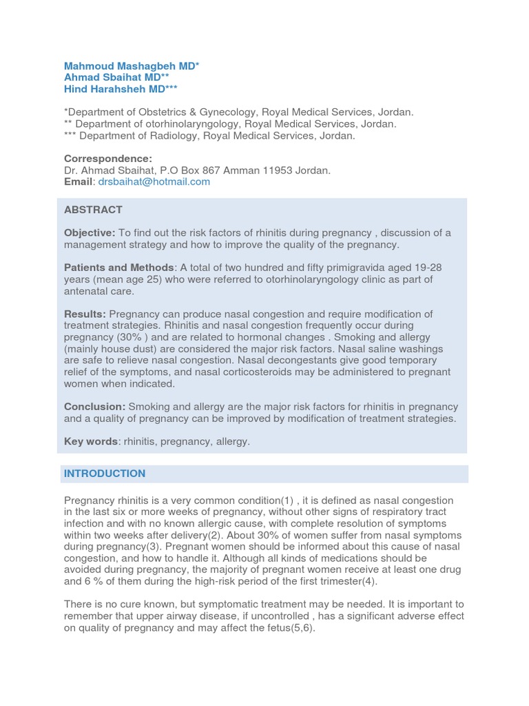Rhinitis affects between 18 and 42 percent of pregnant women. Pregnancy rhinitis can be an early pregnancy symptom that can start during the first trimester although pregnancy rhinitis can develop at any stage of pregnancy. The theory was controversial and according to one expert pregnancy rhinitis was observed as a phenomenon for ages but until recently not recognized as a defined condition worth being taken seriously 1 3 researchers now have defined pregnancy rhinitis as a distinct entity and developed the following diagnostic criteria. Pregnancy rhinitis occurs when your nasal passageways become irritated and inflamed during pregnancy.