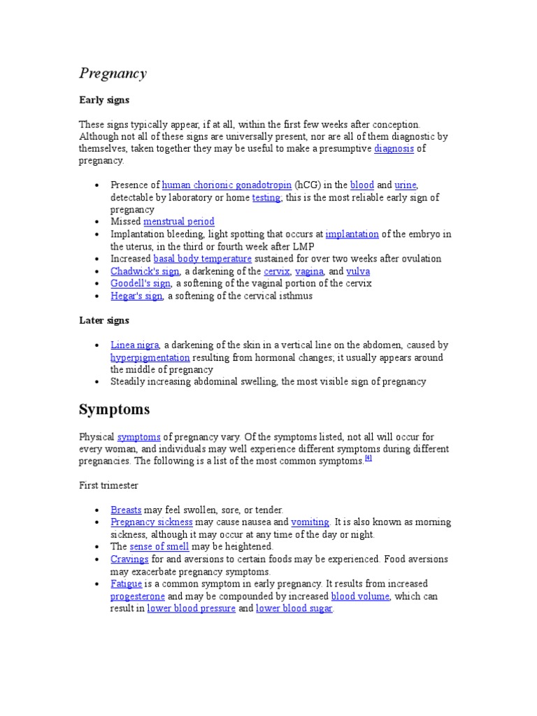 The following early signs and symptoms of pregnancy checklist are only a guideline. While your first sign of pregnancy might have been a missed period you can expect several other physical changes in the coming weeks including. Week 1 to 4. Early signs of pregnancy for women who have a regular monthly menstrual cycle the earliest and most reliable sign of pregnancy is a missed period.