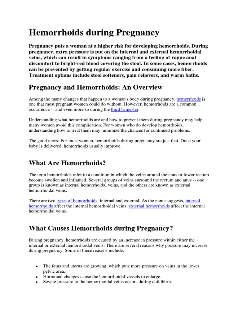 Pregnancy can cause hemorrhoids in large part due to the greater likelihood of constipation during pregnancy. Here are some of the most common signs of hemorrhoids. It s estimated that about 35 of pregnant women will develop them. Pushing a baby may lead to piles fall out.