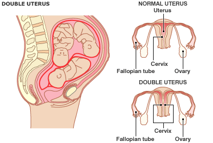 Uterus didelphys sometimes also uterus didelphis represents a uterine malformation where the uterus is present as a paired organ when the embryogenetic fusion of the müllerian ducts fails to occur. If you have a double uterus but you don t have signs or symptoms treatment is rarely needed. The condition may be discovered during a regular pelvic exam or during imaging tests to determine the cause of repeated miscarriages. Usually in such cases there is a chance of going preterm.