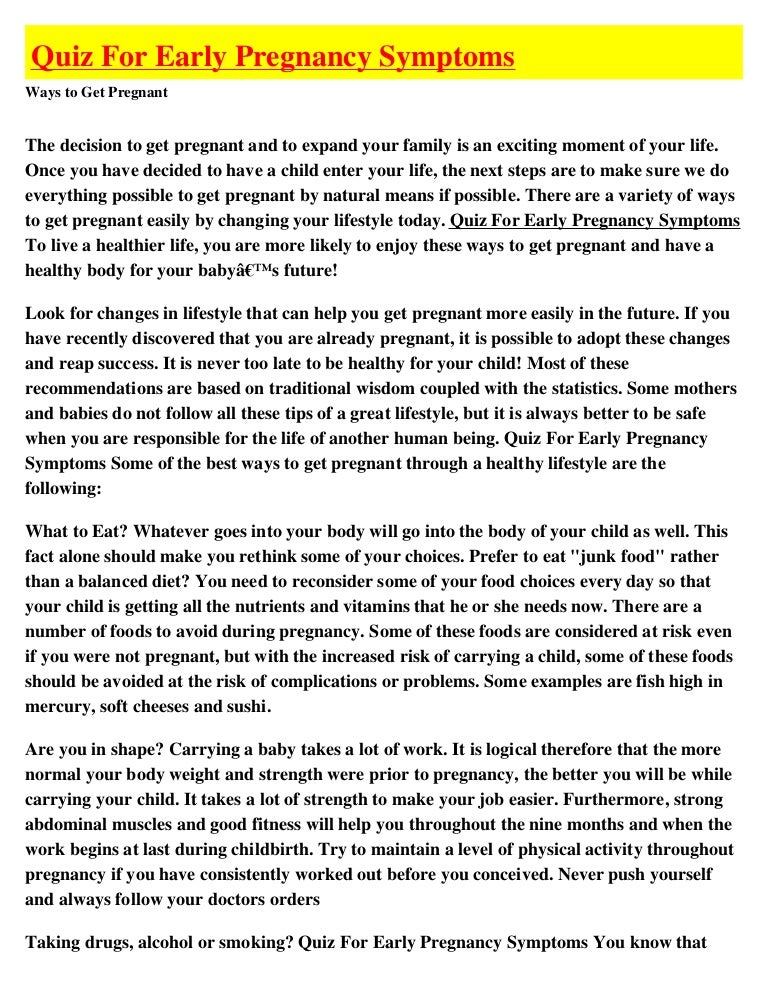 Very early pregnancy symptoms quiz. When taking this quiz or reading the early pregnancy symptoms below please keep this in mind. Brush up on early pregnancy symptoms and take the quiz again. However some women report recognising symptoms as early as week 3 of pregnancy just 1 week after conception according to midwife liz halliday from private midwives. A clearblue easy digital pregnancy test first response early result pregnancy test e p t early pregnancy test fact plus pregnancy test a pink gray or white material discharge from the vagina that does not look like a blood clot is normal in pregnancy.