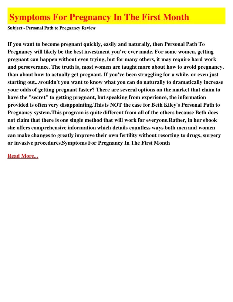 Don t be disappointed if you don t get pregnant the first time. In the first month of pregnancy you may experience certain signs and symptoms. For some women early symptoms of pregnancy begin in the first few weeks after conception. Common pregnancy symptoms at one month pregnant.