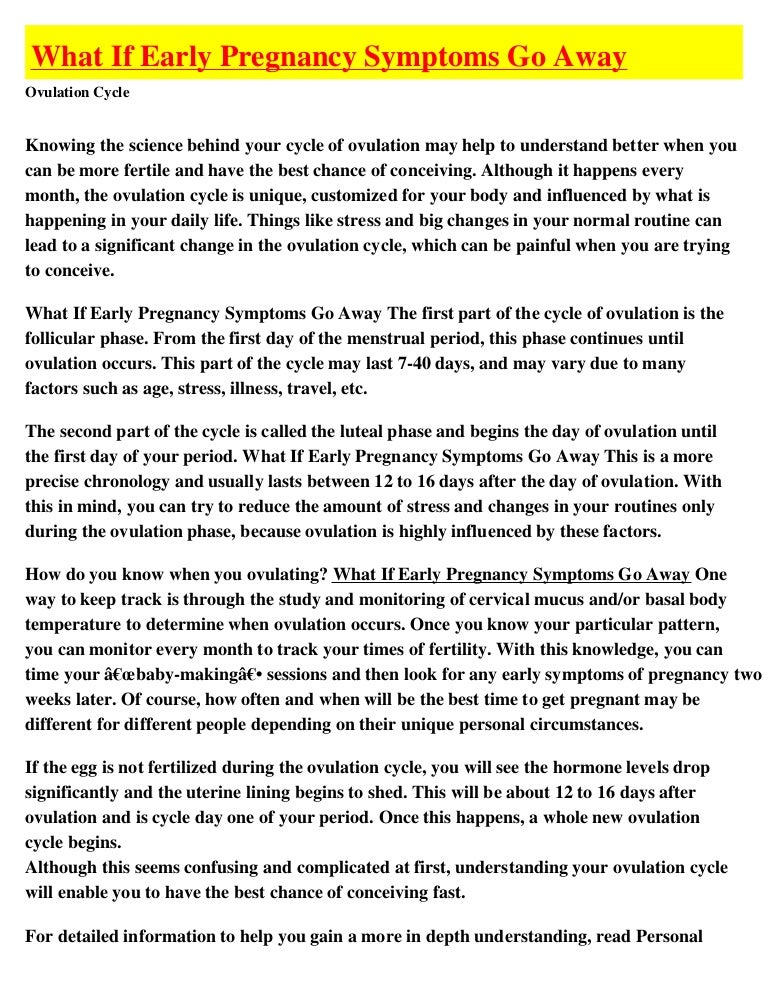 When will pregnancy symptoms go away. Whether a woman is trying to get pregnant or trying to avoid a pregnancy the 2 week wait can be frustrating. Sorry to hear about your previous miscarriage. Some women track their ovulation by looking out for physical symptoms or using. Of note morning sickness usually begins shortly after a pregnancy starts and can extend through the fifth month of pregnancy before eventually going away.